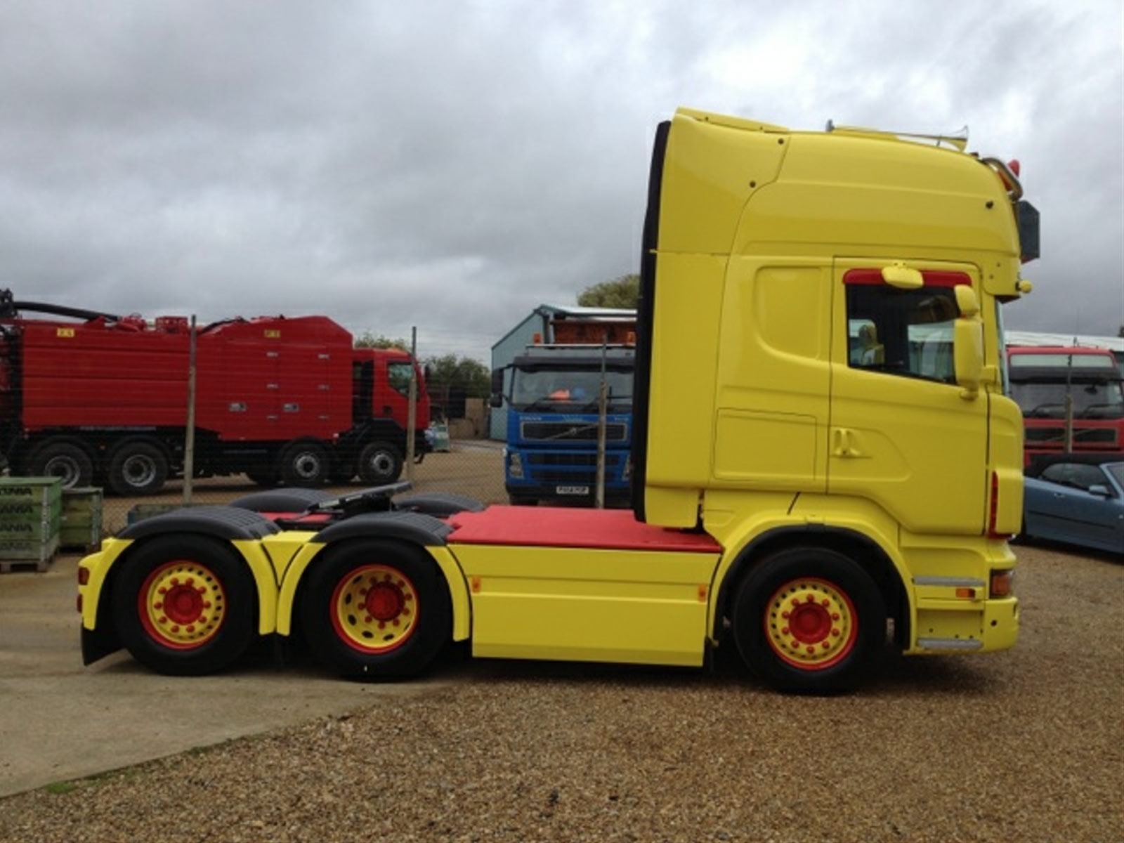 It looks like an R560 tag axle Scania with a rather custard yellow paint job. You can’t say that this is a modest quiet owner driver motor with a paint job like that. Certainly one way to make yourself stand out from the crowd. Extra bars and lights, air horns and even a blind spot camera mounted on the aftermarket visor.
