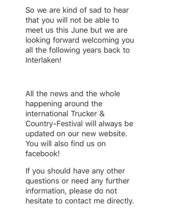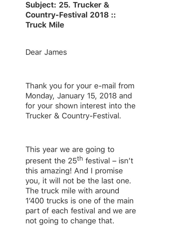 One of the best truck shows and truck show venues you could wish for. We all know Switzerland is one of the most beautiful countries in the world, add a truck show surrounded by mountains and a local brew and bingo you end up with the above!! My truck show partner and myself talked about visiting the Trucker & Country Festival at Interlaken again this year (Having been in 2015 – see the PHOTOS HERE), but for one reason and another we have decided we can’t get there now. Worryingly here in the UK their is a rumour going round that this year is the last year of the Truck Mile at the show. It worries us so much so that James took it upon himself to email the show organisers and ask the question. James asked if this was the last year of the Truck Mile or would be able to go in 2019. This is the email response, apologies for it looking a little odd but I’m sure you can piece it together;