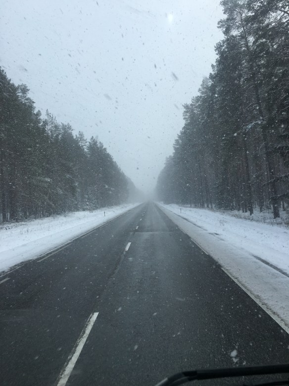 It’s a easy going even with the snow coming down and makes the scenery very nice on the drive. I eventually make it out of the snow after a couple of hours. I stop at the Latvian border to get my road tax, just as I’m setting off the snow starts coming down again.