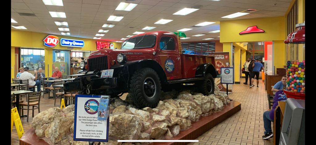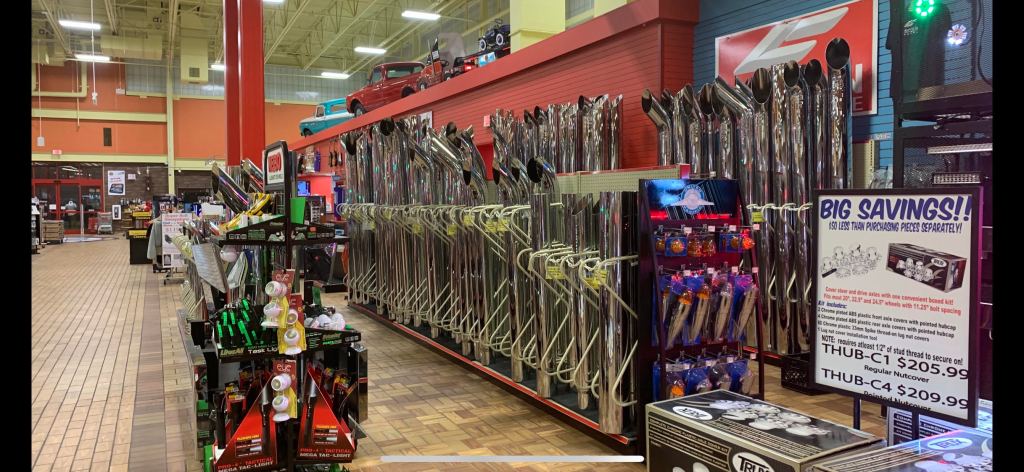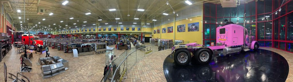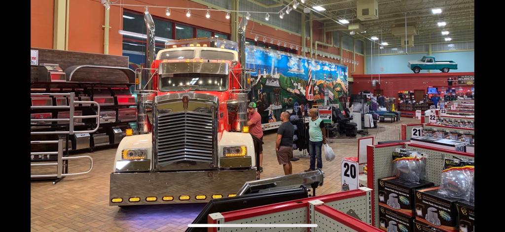 We set off on September 4th and it’s 1240 miles from the workshop. We are double manning in two Freightliner Cascadia’s. I drive a Mercedes-Benz Actros at home so there are some familiar sights and sounds right away as Mercedes have some steak in Freightliner (Both owned by Daimler – TB) as the gearbox is the same, albeit hooked up better than it is in the Merc and the steering wheel and a lot of the buttons and dashboard are the same. Our first destination is Kenly 95 a truck stop in North Carolina. Some of you will know the truck stop shop in Lymm and some of you will know the one in Brescia est (Italy)… well if those two had a baby then put it on steroids you’d get this place! There’s so much in there it’s hard to know what to look for in there. It’s so big it has a Peterbilt truck on a turntable in the window and a Kenworth with a trailer on the shop floor. The highlight was the aisle of stack exhausts that from the other side of the room looked like a church organ!