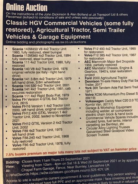 I have no money and certainly can’t afford another truck, so unless by the phrase “auction” they actually mean swap meet, I’m sadly out of this one. I was sent a link to this auction on Friday and I have been dreaming ever since! Some really nice motors here for auction and I’m sure some will go for big money. Plenty of Volvo and Scania but also a couple of nice English trucks and some lucky dip cupboards from the workshop that you can bid to win all the contents. The auction will be held onsite in Burnley, Lancashire and bidding is open until 11am on the 23rd September. It’s all online and you can visit the website by clicking the link – HERE.
