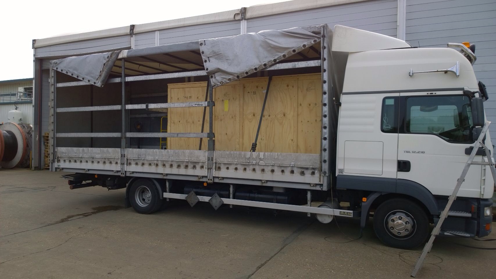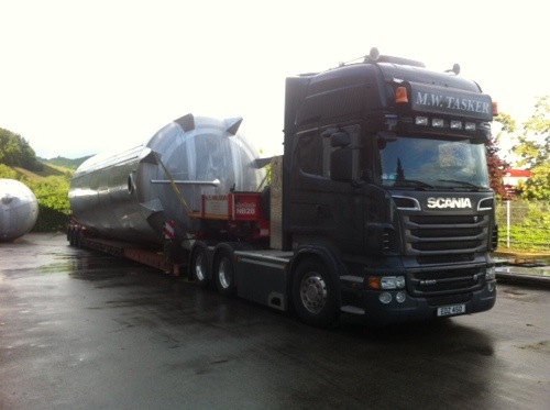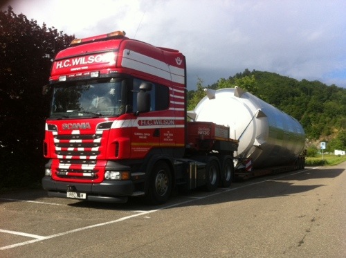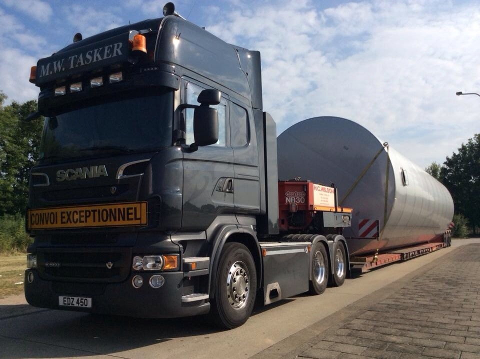 Richard Arnold is the driver of R80HCW, the first R620 Scania that joined the Wilson fleet a few years ago. Seen here today loading a liquid storage vessel in Germany for the UK. The tank is 4.2m wide and 12m long, that’s 12m long in the well of the low loader. No problem for the quiet professional that is Arnie.