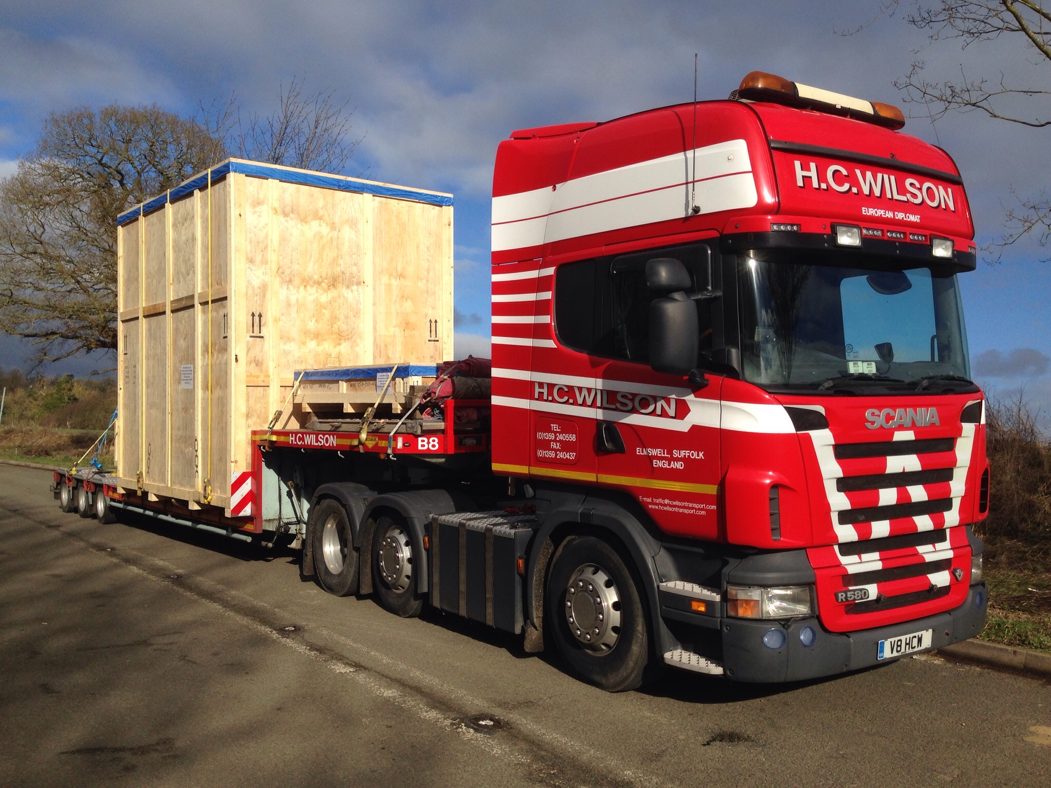 Above and below is part time driver turned office Waller James Cartwright out and about in HC Wilson’s gracefully ageing V8 HCW. More packing cases heading for Felixstowe, at least the UK seems to exporting something. The big case stands at 4.05m high on the floor so one of Wilson’s super low step frames was required to keep it under the UKS height limit of 5 metres. Wheels need a polish JC!