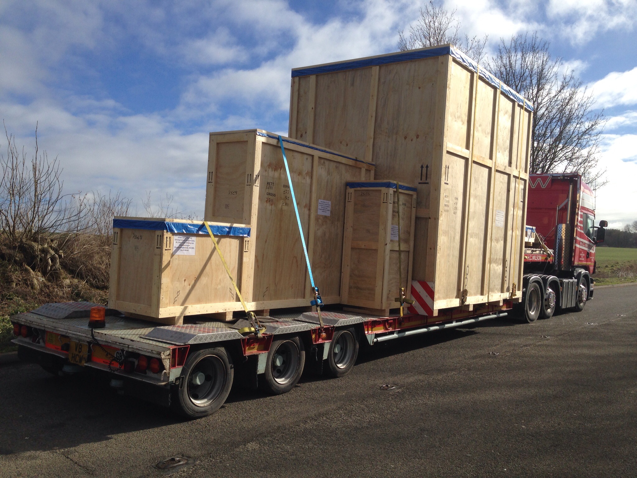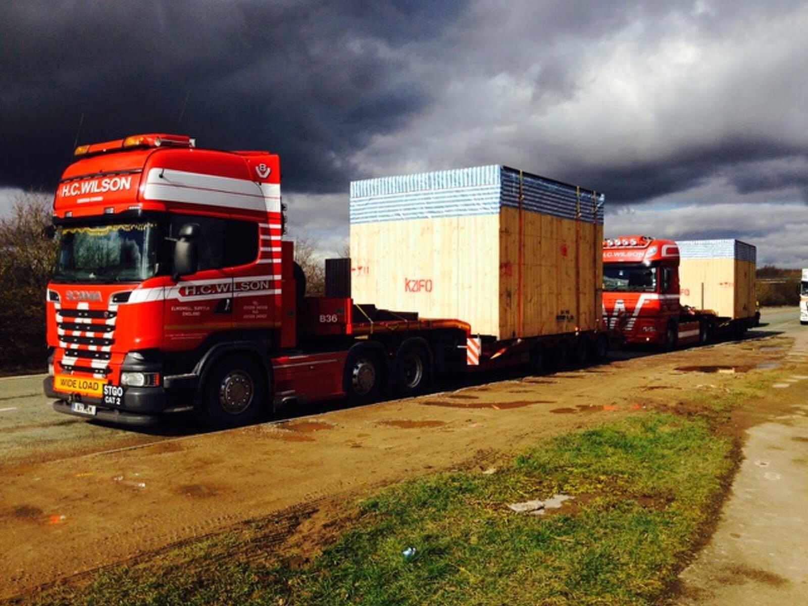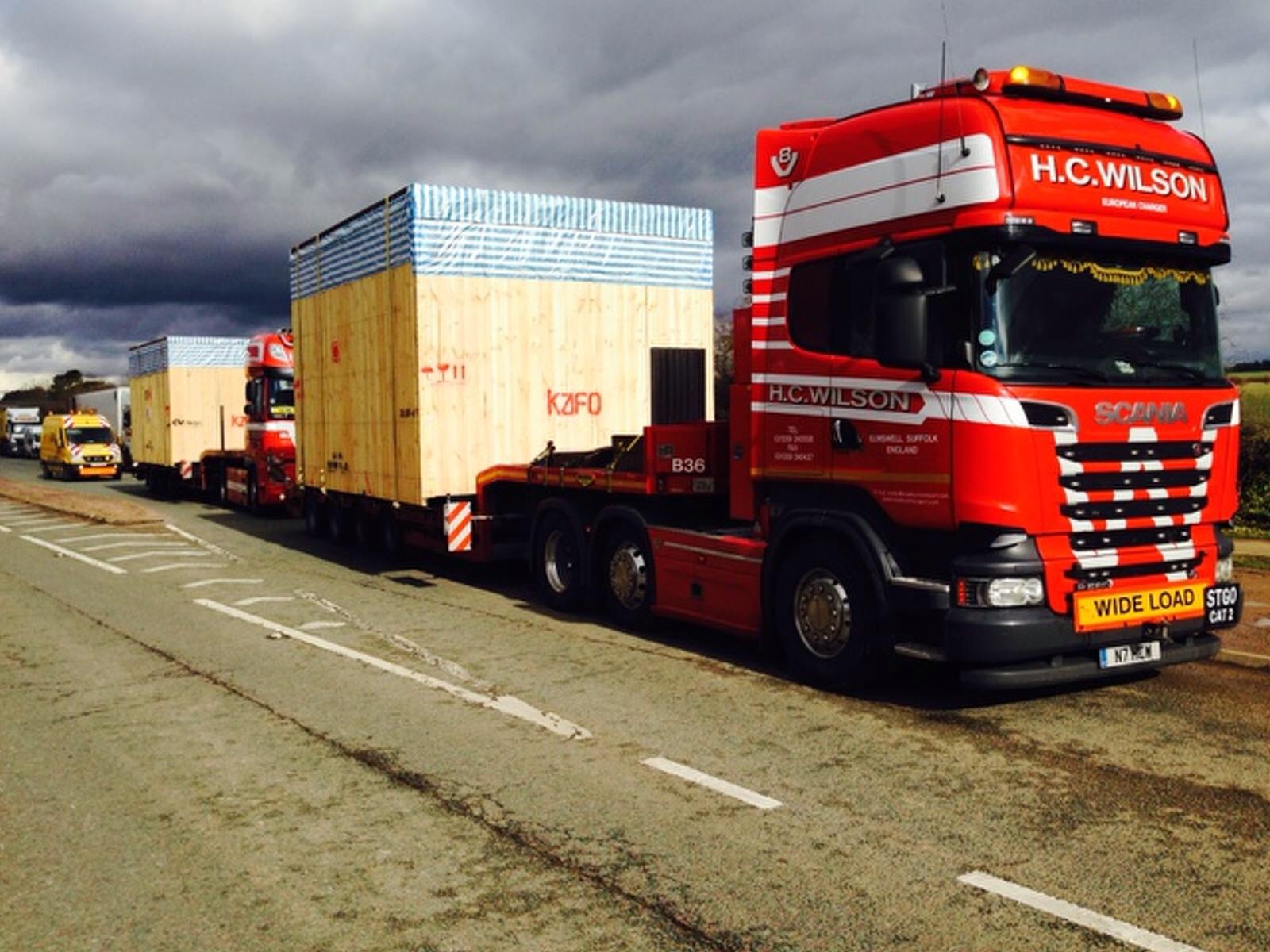 Above and below we have 2 of Wilson’s finest engaged on importing packing cases this time. Both loaded from Felixstowe to Melksham at 4.25m wide. As you can see they were escorted by an accompanying van as the law dictates for all loads over 3.5m wide in the UK. Both Doris DAF and the European Charger have their own Facebook pages, so click on the links and like the pages to start following their activities. Great photos taken by driver Steve Pattison below, with the moody skies against the red trucks it almost looks a bit arty.