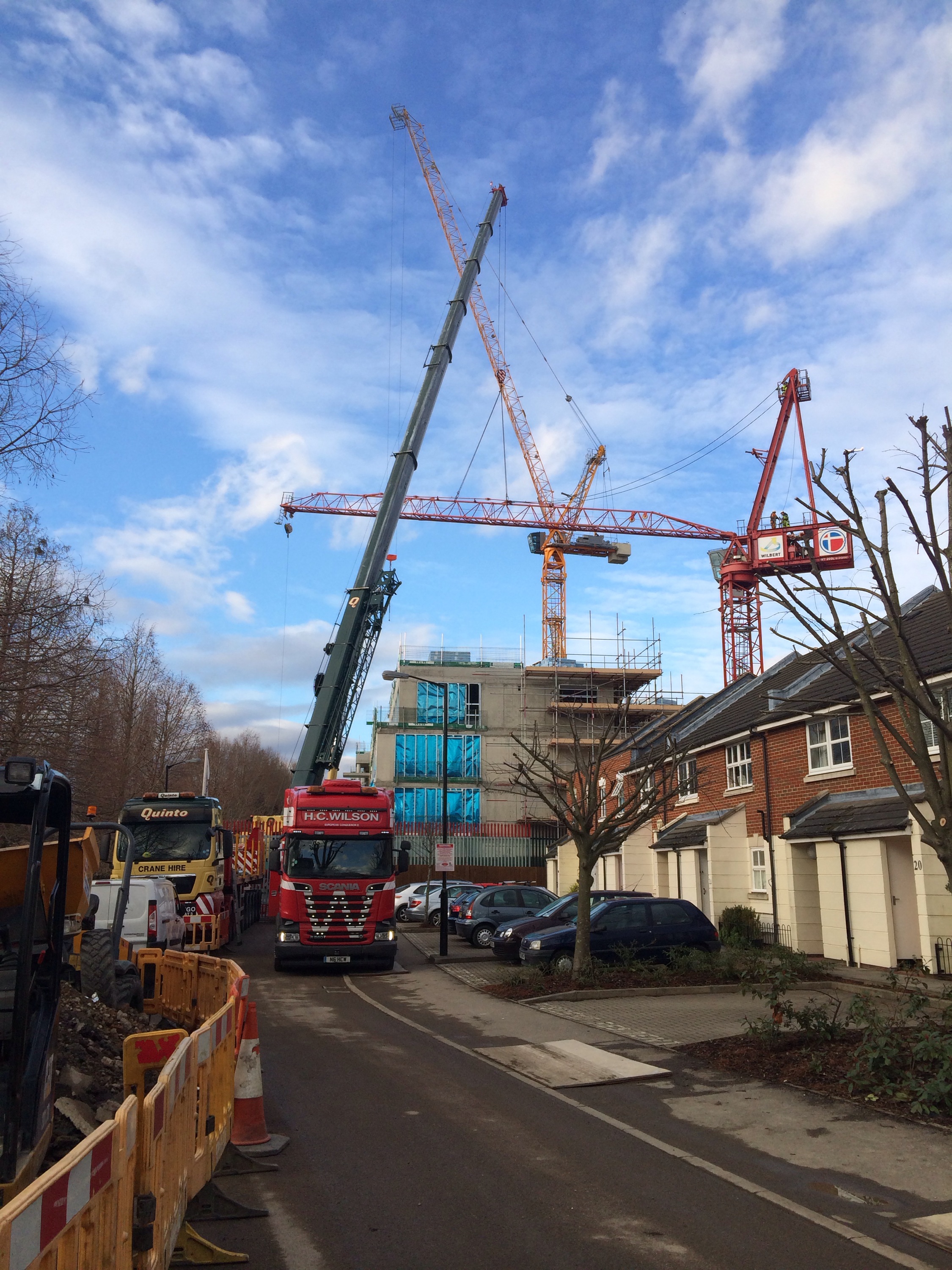 Two great photos of N6 HCW driven by Garreth Rowlands, loading out of a multi million pound development in London SW18 today. Great photos showing the dismantling of a tower crane, note the chap in his high viz right above the counterweight at the top of the tower crane. Some view from up there I reckon. N6 is one of the newest vehicles on the Wilson fleet. The truck is an R560 V8 Scania, which by day looks like another in the long line of red trucks with the big white “W” on the front. But by night she looks a real treat, LED lights to the front, a fully lit big white “W” on the front grill, rear cab perimeter lights and a smaller red “W” mounted at the top of the back of the cab.
