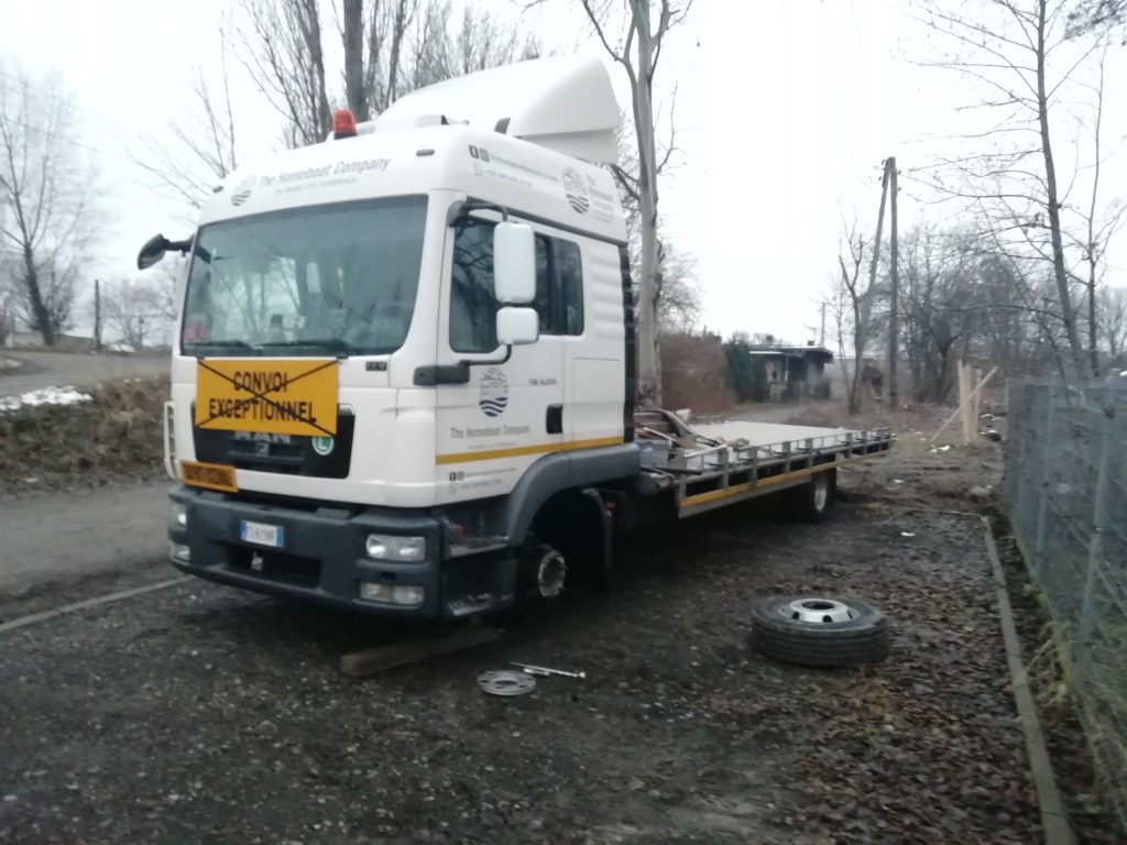 Marshy is based near Warrington in the North West of England, not a million miles from Liverpool. The job started on Thursday, with the loading of a transformer housing from Sherburn in Elmet in Yorkshire. The little MAN TGL was built to Marshys own strict requirements and although it added a fair amount of weight, the importance of a sliding roof on the 12 tonner has been proven over and over. The truck has everything required to load a large but sensitive item through the roof and transported over 1200 miles to its destination. Once loaded it’s off down the A1, A14, M11, M25, M2, A2 to Douvres. Boat to Calais and then off down through France, up and over Mont Blanc and into Italia.