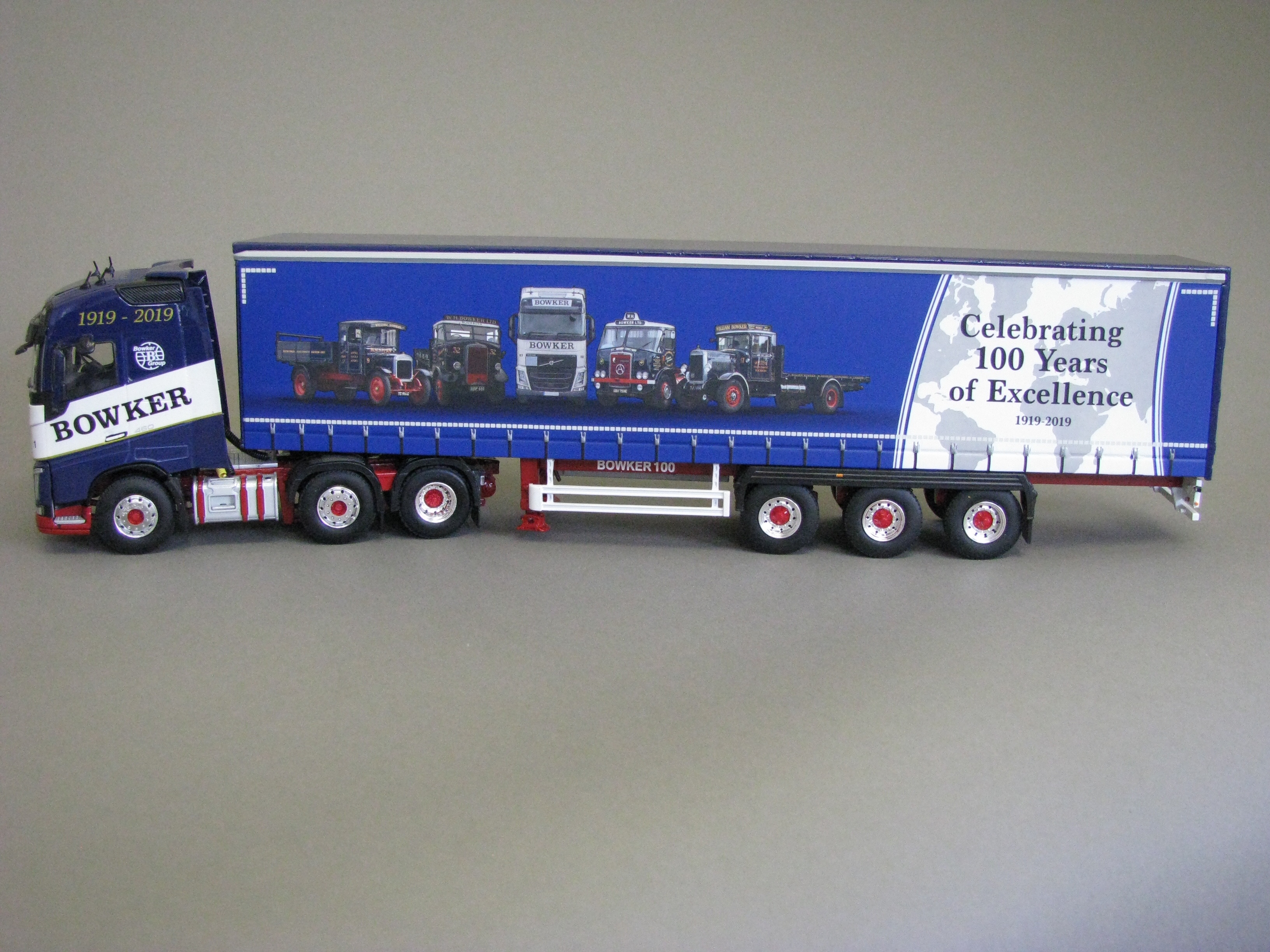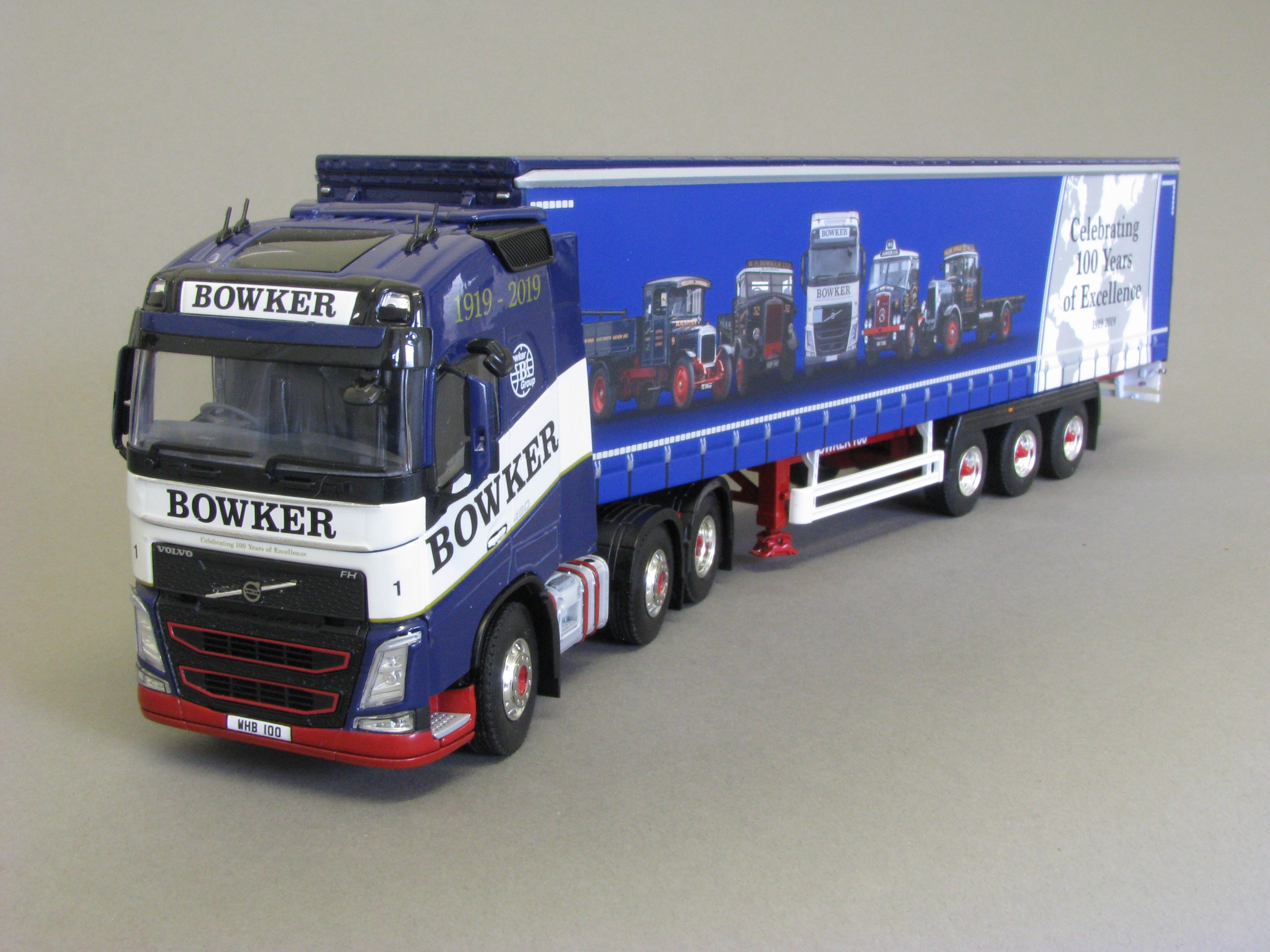 Customised promotional model vehicle specialists, Search Impex, are pleased to announce the release of a 1:50 scale Volvo FH Globetrotter (6×2) tractor unit with 3 axle, curtain trailer, customised in the eye-catching, centenary livery of W.H. Bowker Ltd. Produced exclusively for Search Impex by WSI Collectibles, the model is a certificated Limited Edition (205 pieces) and has been commissioned by Bowker to celebrate their 100th anniversary in 2019. It is based on their real life Volvo FH units and curtain trailers bedecked in the special 100 years anniversary livery – two of which have recently joined the Bowker fleet.