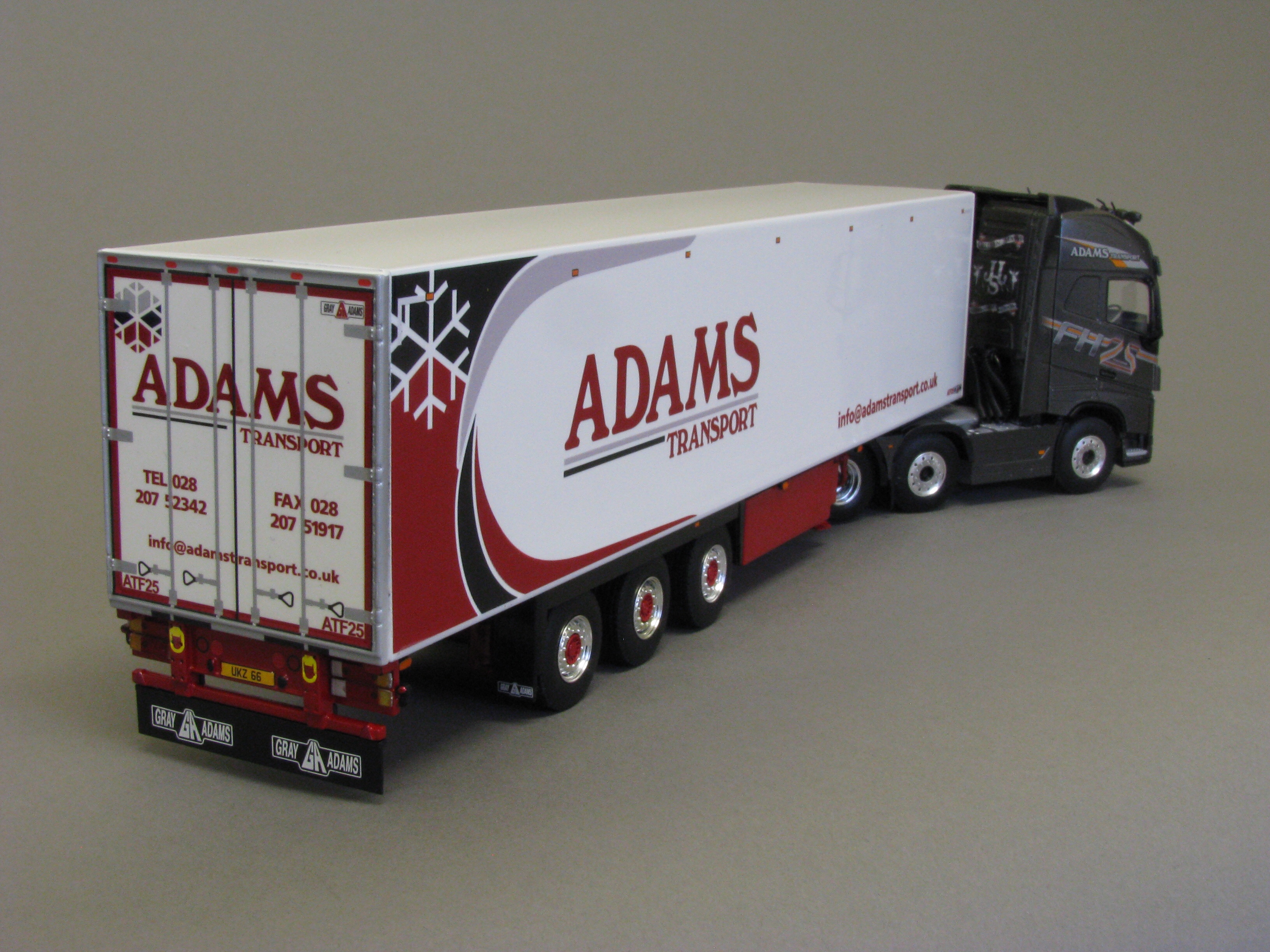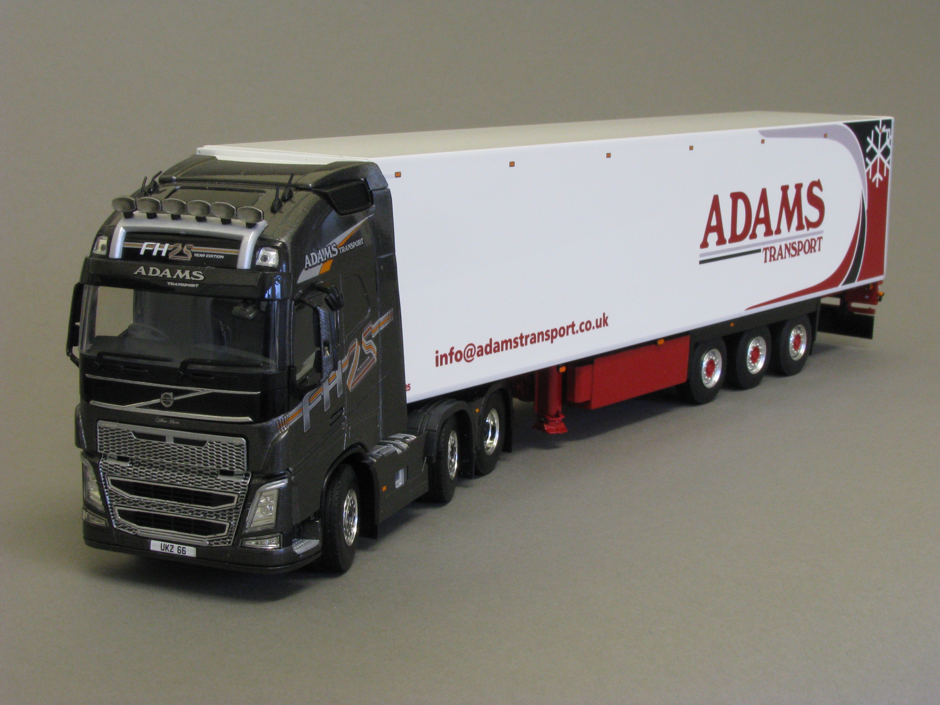 Customised promotional model vehicle specialists, Search Impex, are pleased to announce the release of a 1:50 scale Volvo FH XL 25 Year Special Edition (6×2) truck with fridge trailer, customised in the new eye-catching livery of Northern Ireland based operator Adams Transport. The models have been produced exclusively for Search Impex by WSI Collectibles as a certificated Limited Edition (175 pieces).