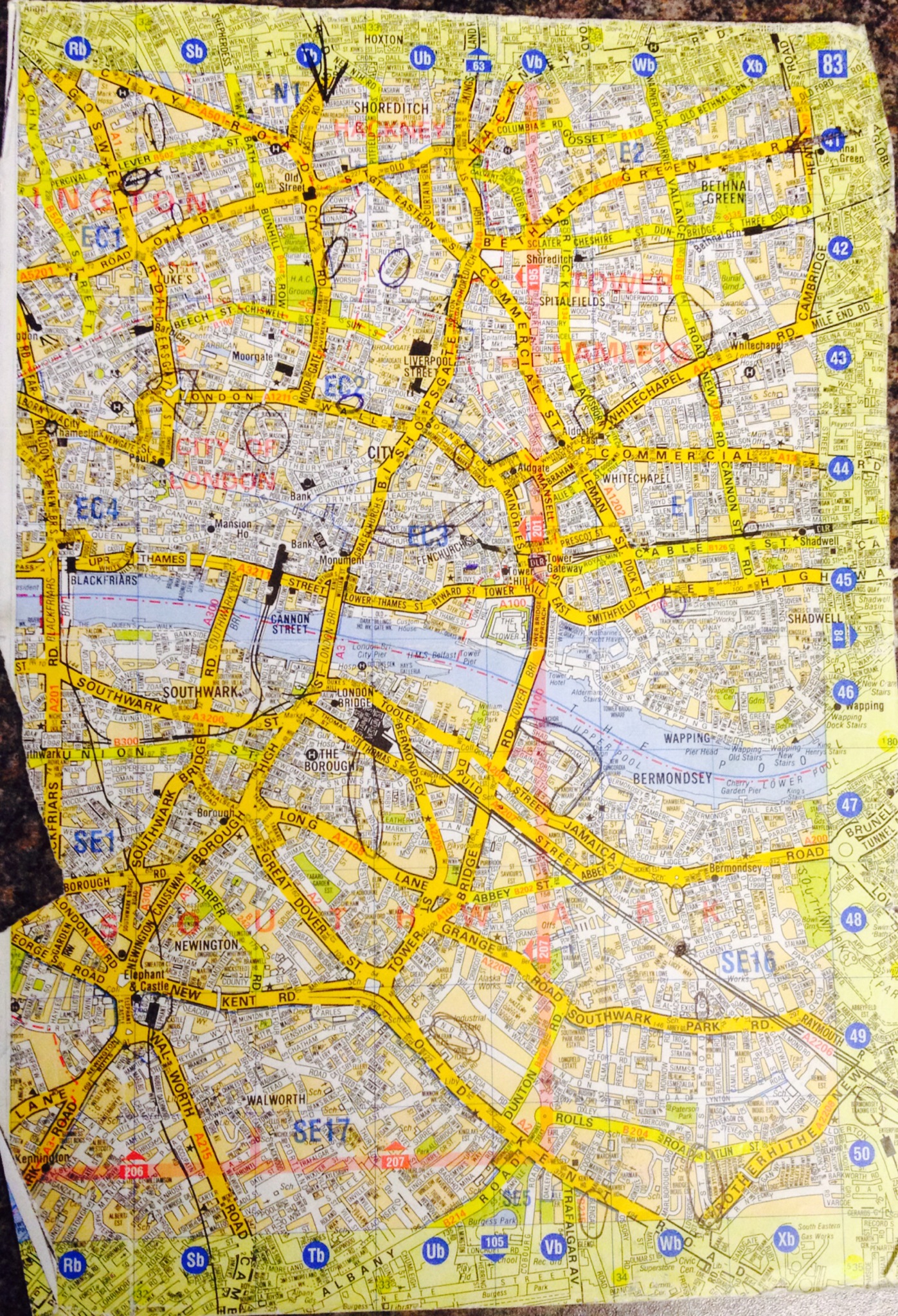 The beauty of a paper map over a twat sat nav is that I find I can always see more than I need to, which can only ever help you know where you are and what your surroundings are. For example heading into London the other Saturday as a passenger I decided we would have a Map-Off. This was fine and a good contest and we both arrived at the right place with no major dramas, but along the way I could check each street I passed and I could see how far ahead the next turning was, without having to wait for the 200 metre warning or what ever it is. Also looking at the map you can get some idea of what the road you are turning into is like or which way it goes, something which twat sat nav can’t do very well. The one downside I found to the paper map is that it doesn’t light up when you enter a tunnel!!