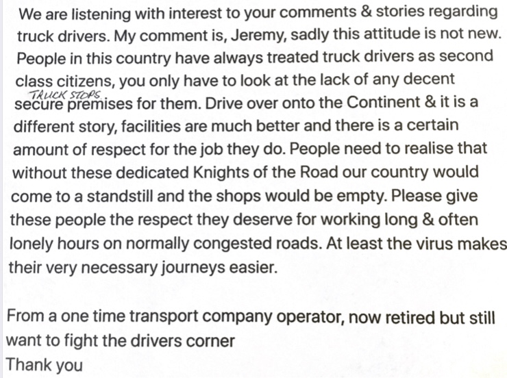 I got an email on Monday from Mum saying she had emailed Jeremy Vine on BBC Radio 2 sticking up for us truckers. As always Jeremy Vine has clearly made some derogatory comment about those he doesn’t understand or below his social class and wound Mum up. So she emailed the above email to Jeremy Vine to stick up for truckers. Sadly and not surprisingly as yet no answer from the BBC. When mum also emailed she tells me that on her WI notice board at the top of the drive for all the villagers to see, she has printed out an A4 Support The Lorry Drivers poster as above.