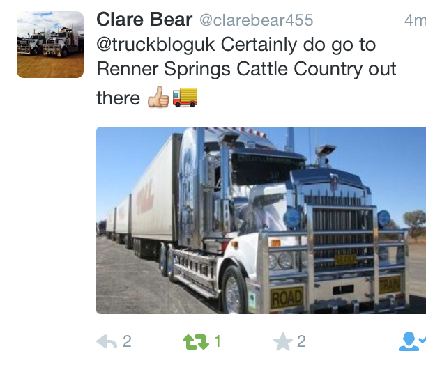 What an awesome looking rig! I think Australian trucks looks more imposing than the Americans, as in general the cabs sit higher due to the nature of some of the roads and tracks across the outback. This K’whopper is driven by a trucking mad woman called Clare. Last night I was Tweeting into the future and Clare was tweeting into the past. It was getting on for midnight Saturday night here in the UK but it was early Sunday morning down in Australia. I was lazing on the sofa watching the TV while @clarebear455 was trucking along some where 1200km north of Perth in Western Australia, the wonders of modern technology! Clare drives and polishes the gorgeous looking KW for her boss and who can blame her with such a fancy looking rig. The road train is powered by a 650hp Caterpilar power plant, pulling 3 articulated trailers, weighing in at approx 135,000kg and around 55 metres long, at this size Clare can still truck along at 100kph. Here in the UK it’s a different world entirely, max length is 18.75 metres on a drawbar (rigid truck with a trailer), 44,000kg on 6 axles, limited to 89kph. I know where I’d rather be, I’d happily swap 1000 cars on the M25 for 1000 kangaroos! If your on twitter follow Clare by searching for; @clarebear455