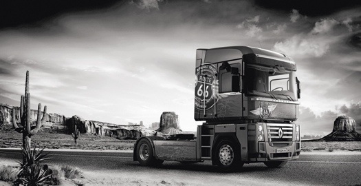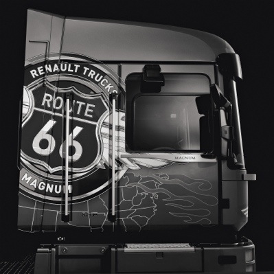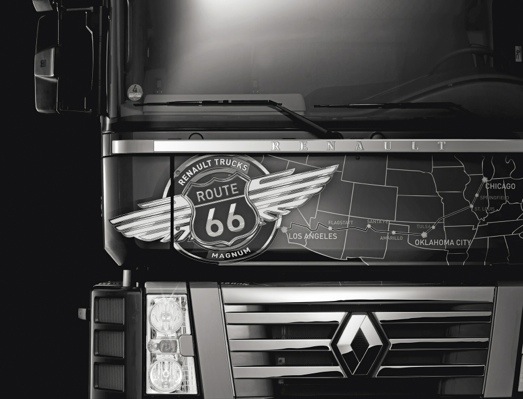 With its “Route 66” operation in Spring 2009, Renault Trucks combined two legends: the brand flagship “King of the Road” Renault Magnum and the famous Route 66 which crosses the United States from Chicago to Los Angeles. In the autumn of the same year, at Le Mans, Renault Trucks presented a Magnum decked out in the colours of Route 66 during the 24 hour Truck Race. As a result of the public’s enthusiasm and the interest generated by this vehicle, Renault Trucks decided to launch in France a Magnum “Route 66” limited edition with specific exterior decoration, exclusive upholstery and superior equipment. A Magnum designed to blend the excellence of Renault Trucks with the American dream.