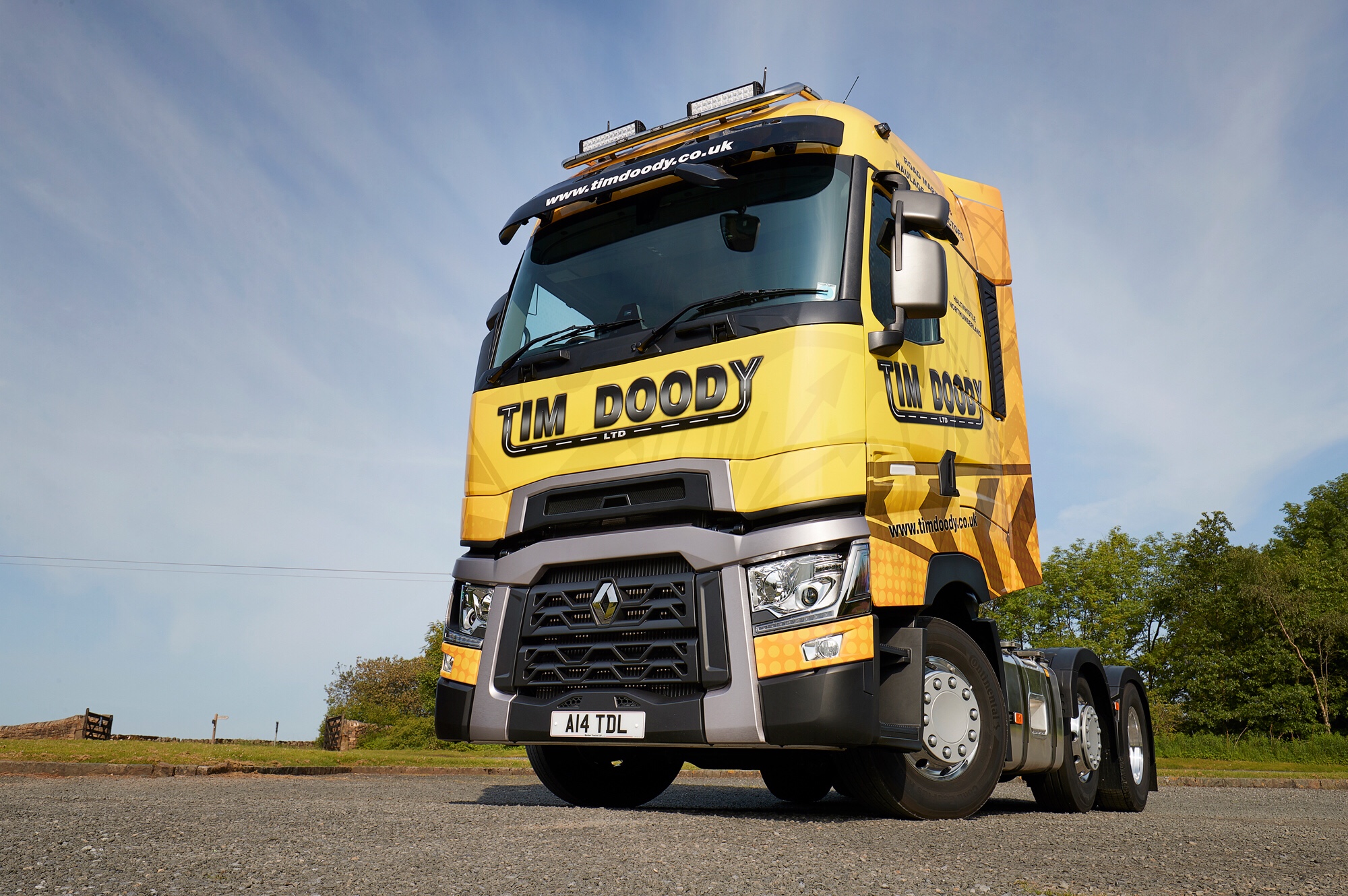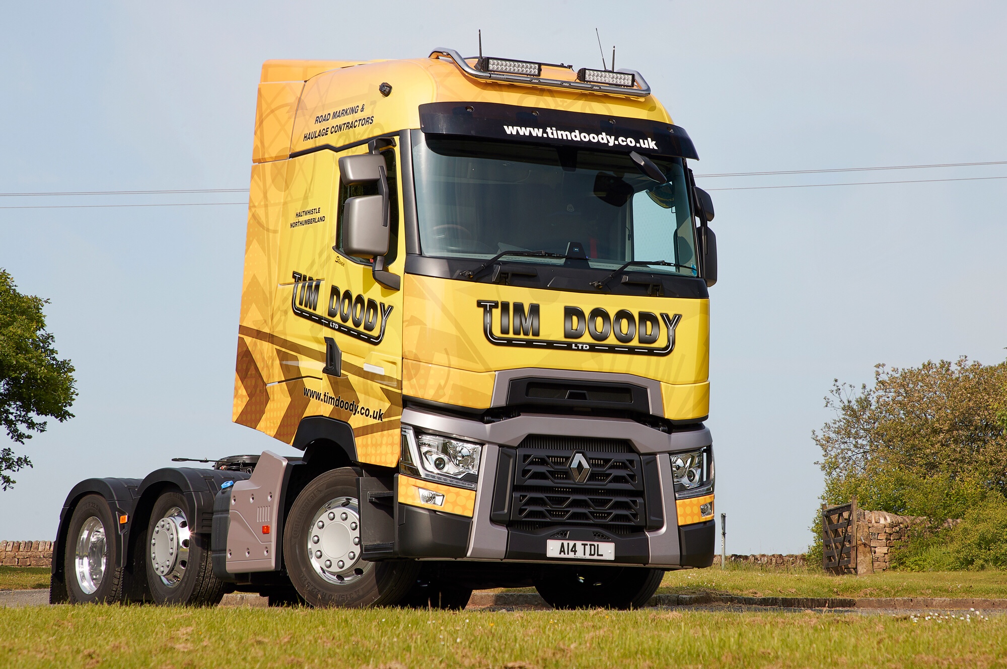 Road marking and haulage specialist, Tim Doody Limited, has taken delivery of the company’s flagship vehicle, the first right hand drive Range T High to be ordered in the UK. Liveried in Tim Doody’s distinctive new bright yellow branding, the T520 High 6×2 tractor unit, supplied by Renault Trucks dealer Border Trucks, is an addition to the company’s fleet of 22 vehicles and was ordered to meet ever-growing customer demand for its services.