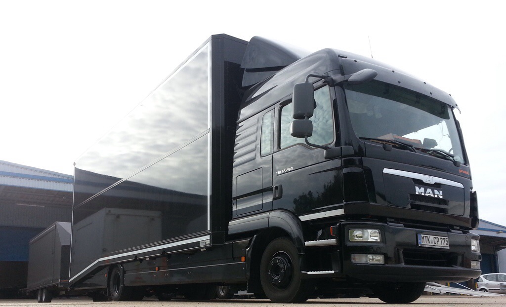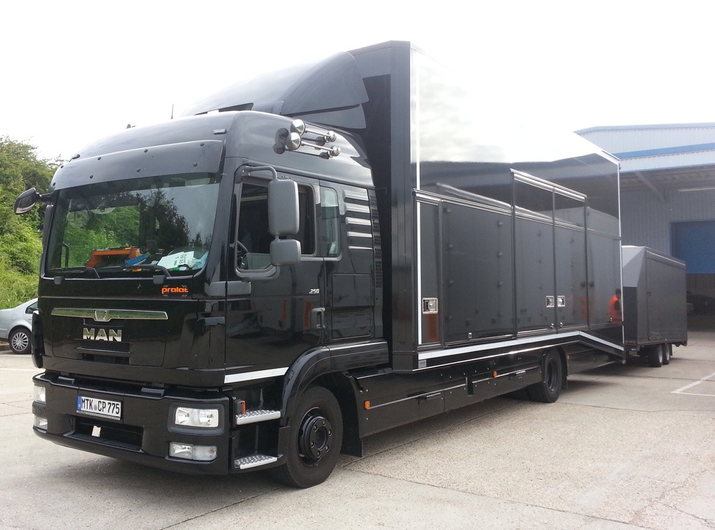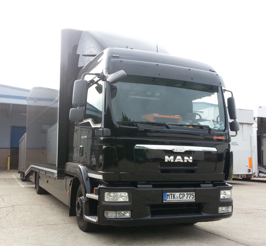 Just look at the shine on the bodywork. The truck is a Euro 5 MAN TGL LX 12.250. It must be Euro 5 as it’s not got the Euro 6 grill. So for a truck that is a year or 2 old to have such a shiny paint job is fairly impressive. The truck has an internal ramp that can lift a car enabling a second car to be put on the lower deck, or even his trailer can be put on the ramp to avoid paying road tolls on 4 axles. Even with painted wheels it makes for a truck that delivers the kind of impact and professionalism you’d want the driver to have when delivering supercars. Hopefully we will see or even hear from this truck/driver again in the near future but in the mean time I’ll thank @steviebloke again for the photos.