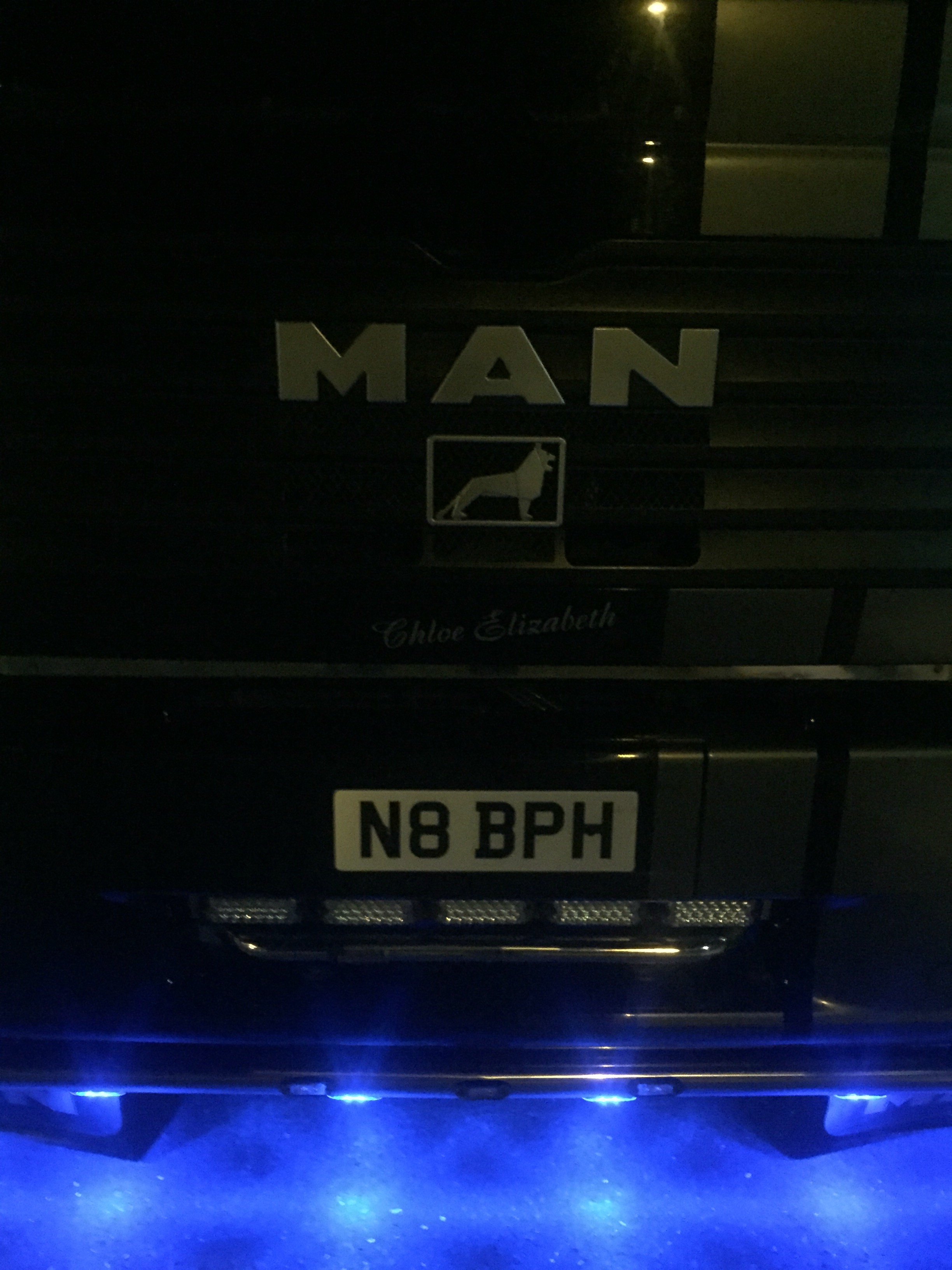 The truck was once a boggo standard TGL LX with a matching black box body. Fancing a new challenge and a change from the Italians Brian bought the truck and soon set to the bodywork. A local chap put together a fag-packet proposal for the beavertail bodywork and feeling brave Brian said yes! If you get a chance to look at the body it is a masterpiece in cutting and welding. As for the rest of the outside, a whole host of marker lights, spotlights, home made half shaft covers and some custom made graphics. The full set of light bars down the down and round both the top and bottom of the can were custom built by Jimbars. A small one man band is Jimbars but he does seem to be a favourite with the owner drivers, having even supplied a few bars to other MAN TGL ambassador, Steve Marsh Express. I have to say the exterior of Brian’s little MAN is one thing but oh the interior is something else. My photos are rubbish and just don’t do any justice whatsoever to the one off, cosy black leather lining that luxuriate the little German.