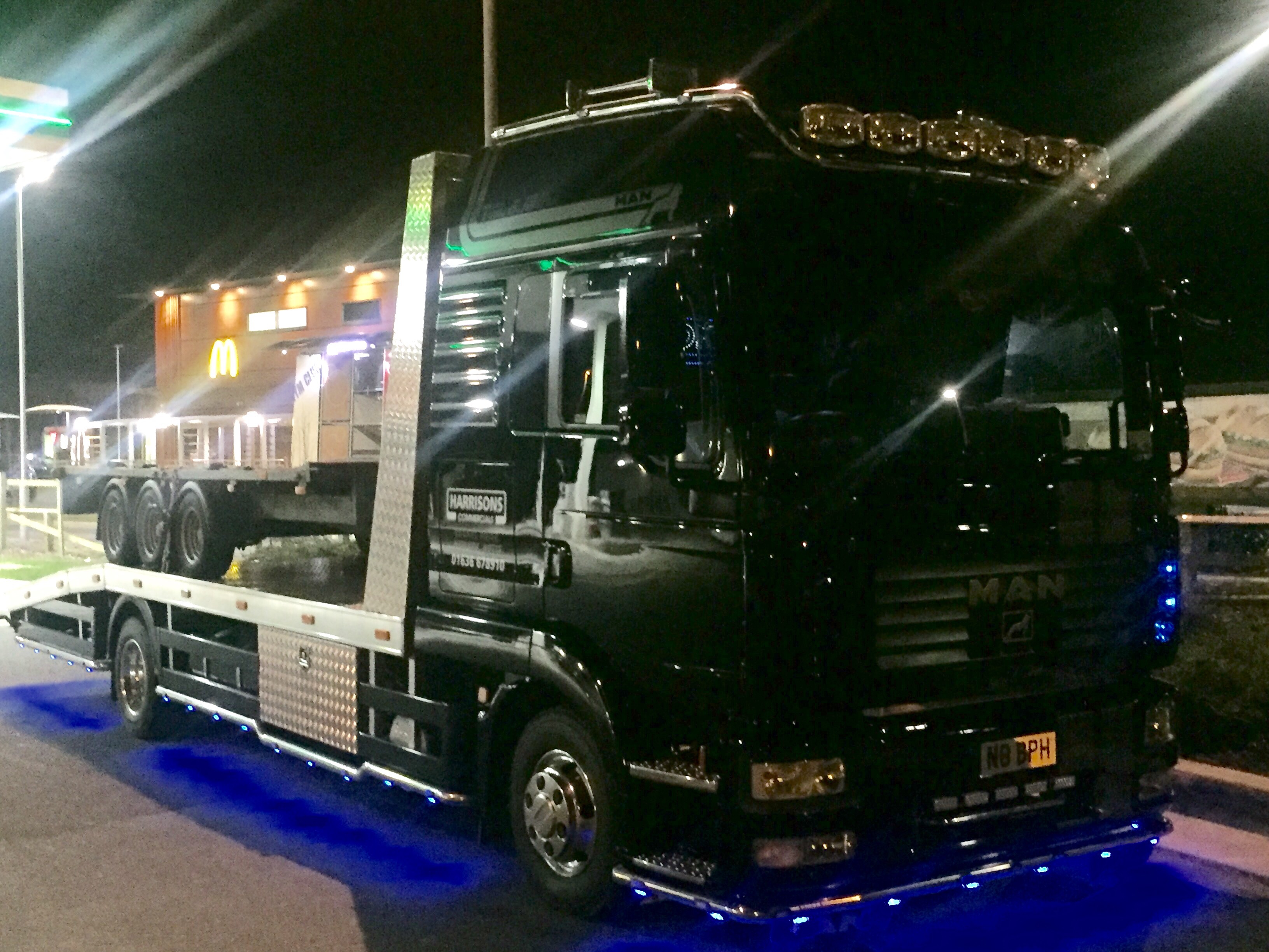 Can’t beat a little truck with a big cab! I’ve long been a fan of a Space cabbed 7.5 – 12 tonner, whether it’s an Atego, a DAF or the delightful MAN TGL. Having run both a MAN and a Mercedes myself, it’s very difficult to pick a winner between the two, they are both great trucks and full of big truck feel. The likes of DAF don’t do their own big cab but the Hatcher Components conversion is very good but isn’t factory finish and then there’s the Iveco. Anyway back to the little truck in the photo, you’ve probably seen it at one of many Truck Shows last year where owner Brian Hill picked up more than a couple of decent trophies including a number of 1sts. I’ve been trying to get to see the truck for a wee while now and of course meet Brian. The truck is used by Harrison Commercials to collect and deliver vans to and from auction houses and the like and their Newark base.